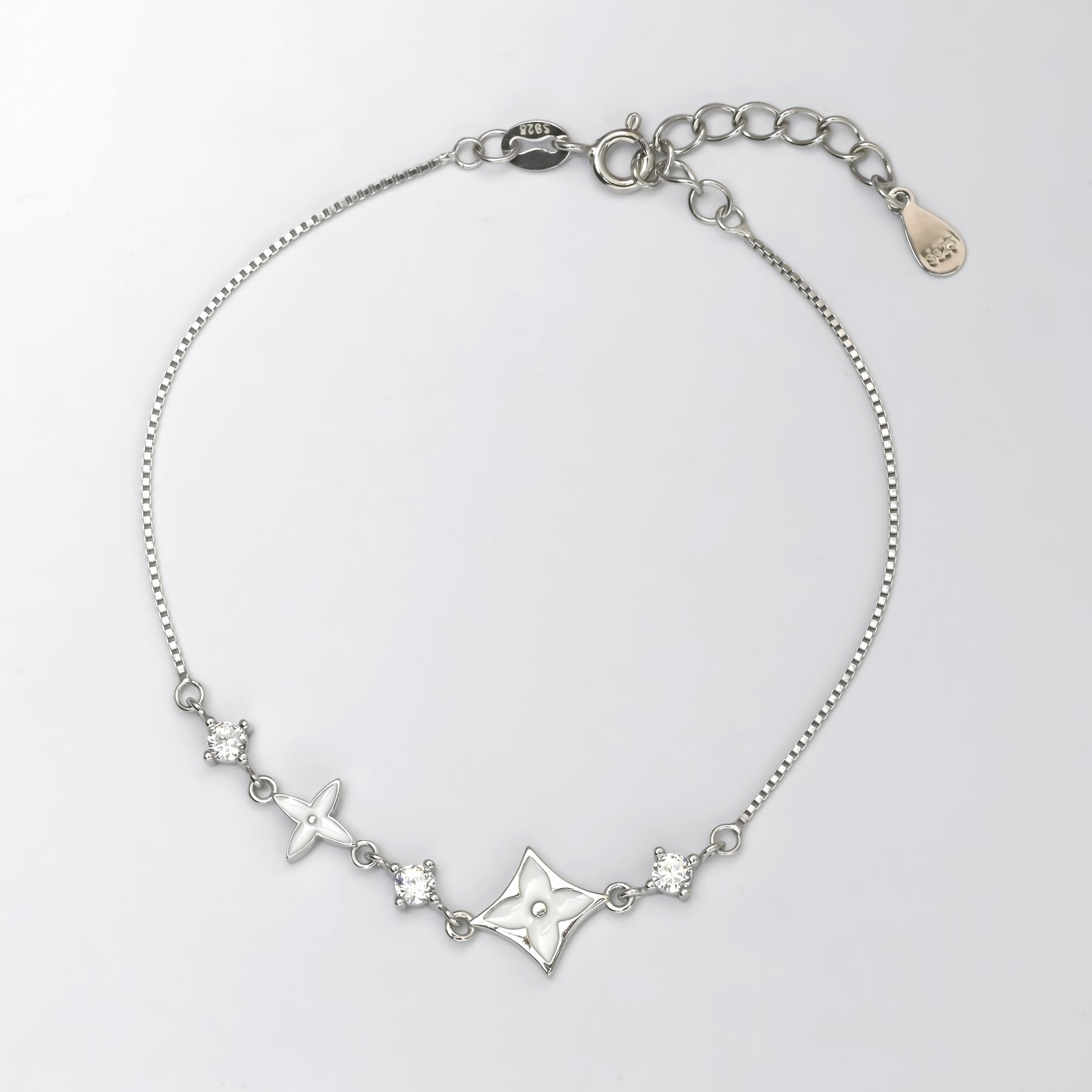 A graceful sequence creates a rhythmic charm. The alternating sparkle and petals form a refined line that sits softly on your wrist. Finished with an adjustable extension chain for a just-right fit.