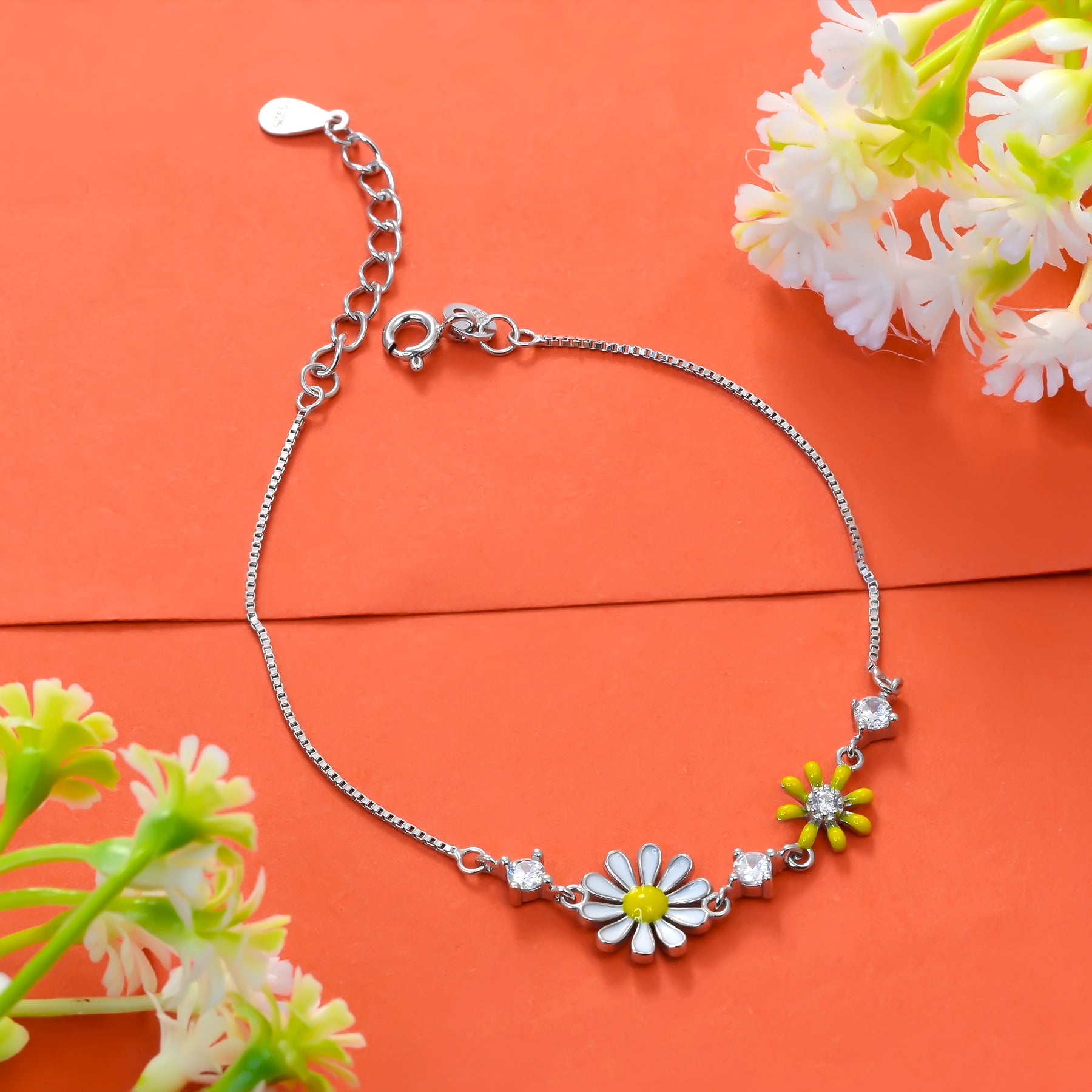 A graceful rhythm unfolds across your wrist. The larger daisy motif anchors the design, while its smaller twin and three sparkling stones bring a delicate balance. The adjustable clasp ensures a comfortable and perfect fit.