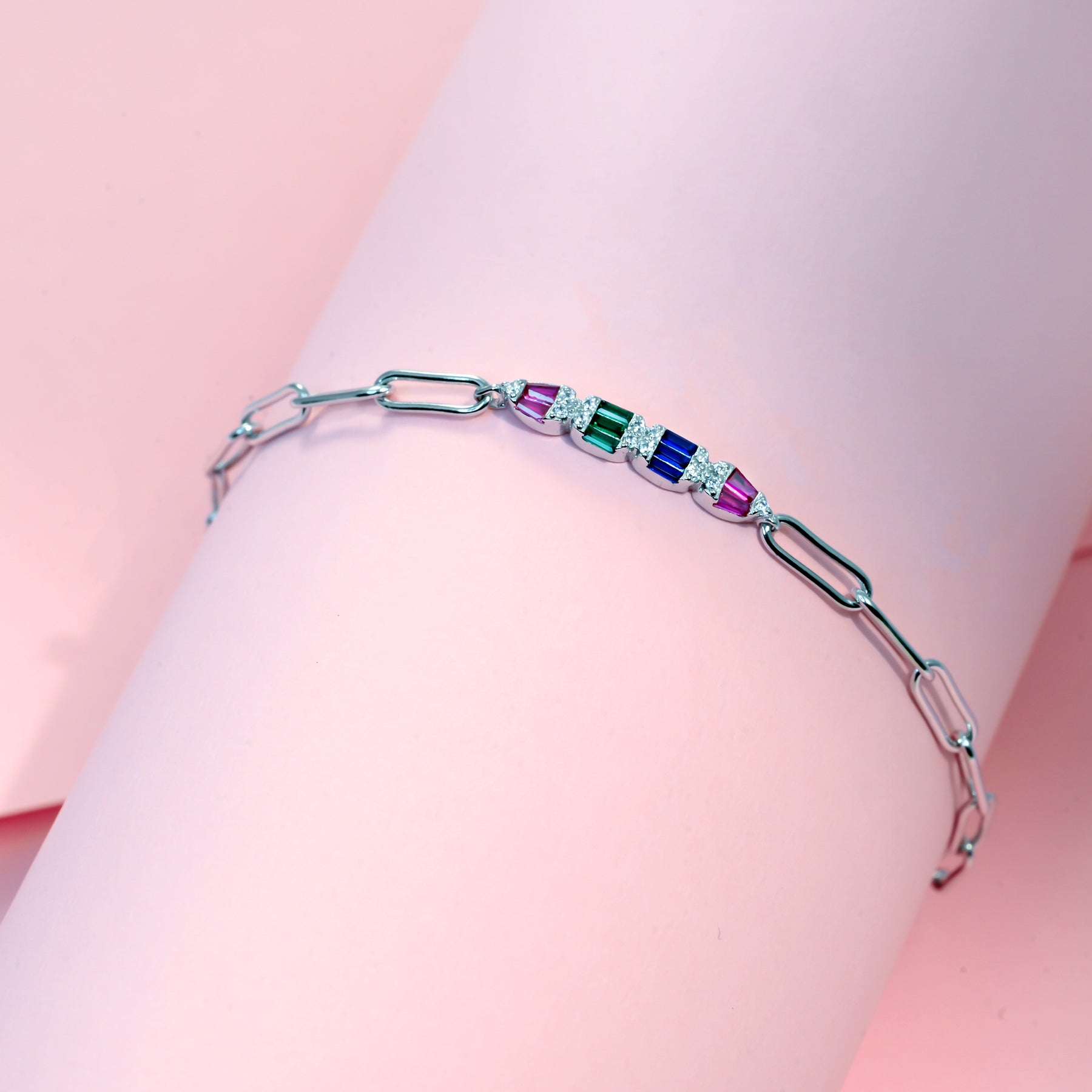 A geometric beauty—four squared shapes crafted from pairs of baguette-cut stones, set evenly along a delicate chain. Finished with an adjustable clasp for a perfect fit.
