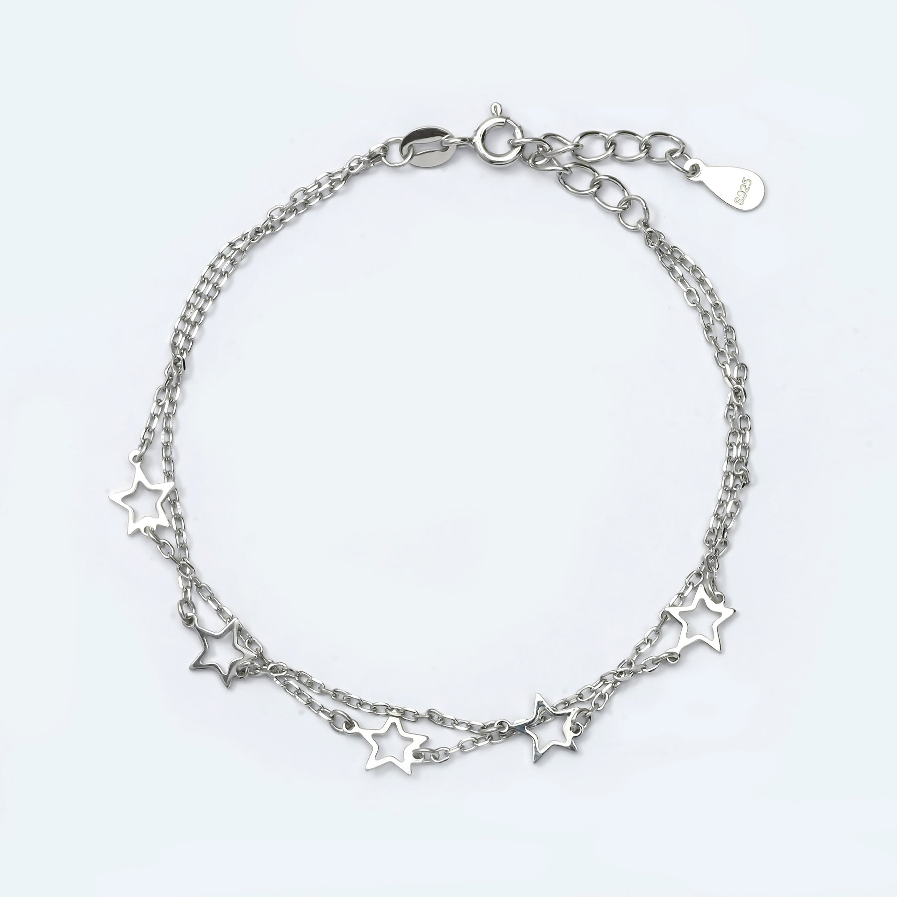 Twice the charm, double the shine. This silver bracelet layers two delicate chains, each adorned with three dazzling stones—reflecting the beauty of balance, just like YOU.