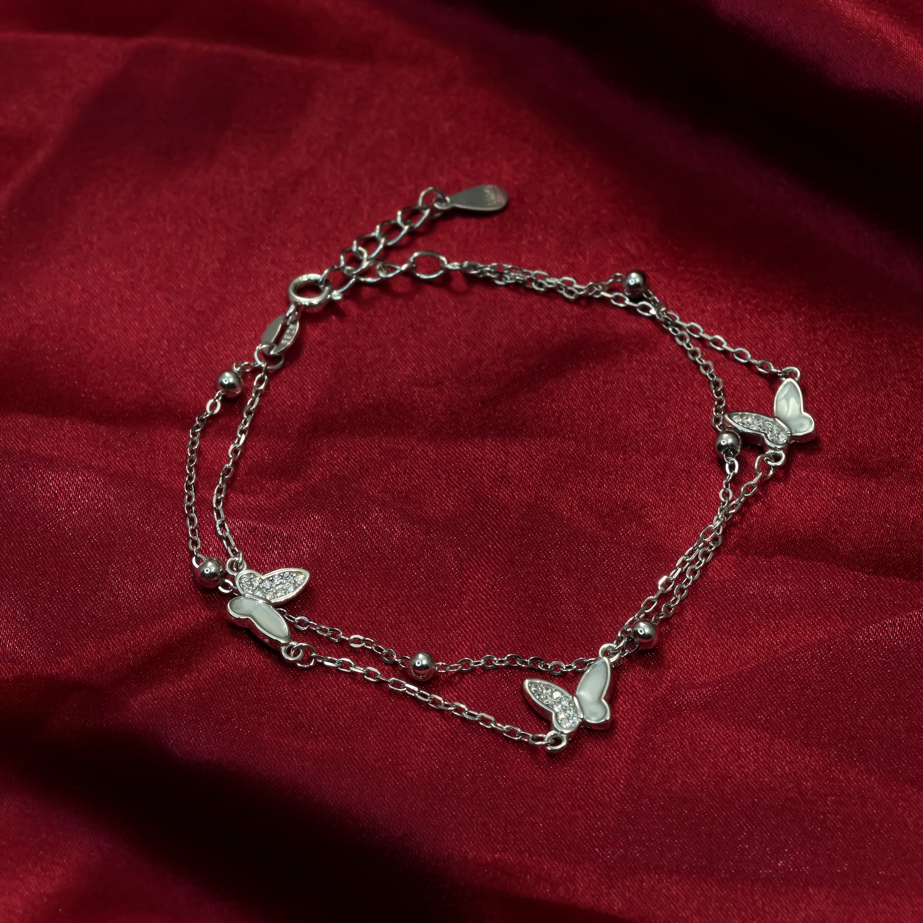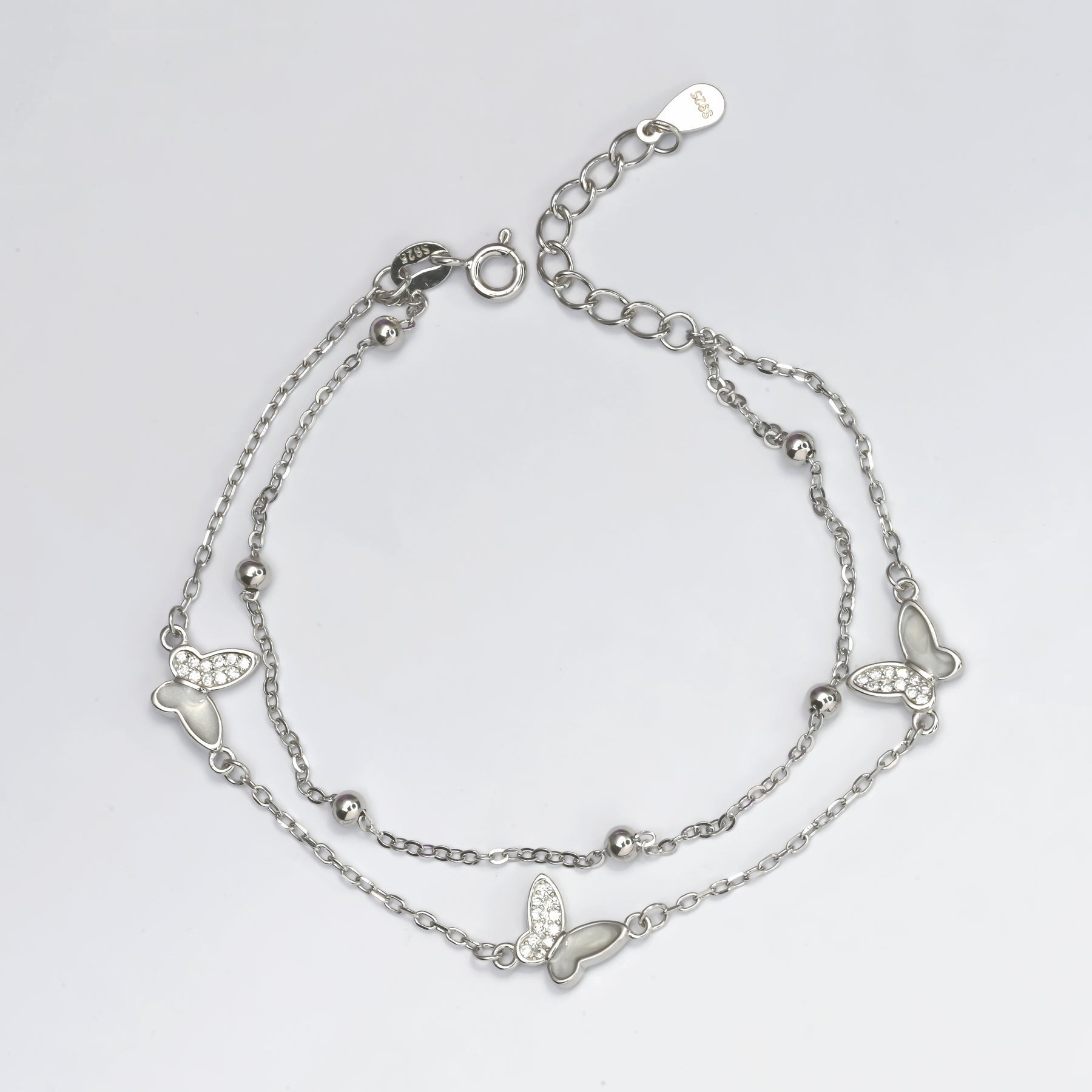 Features a stylish double-chain design: one chain adorned with five smooth beads and one with three delicate butterfly charms. Finished with an adjustable clasp for perfect layering and comfort.