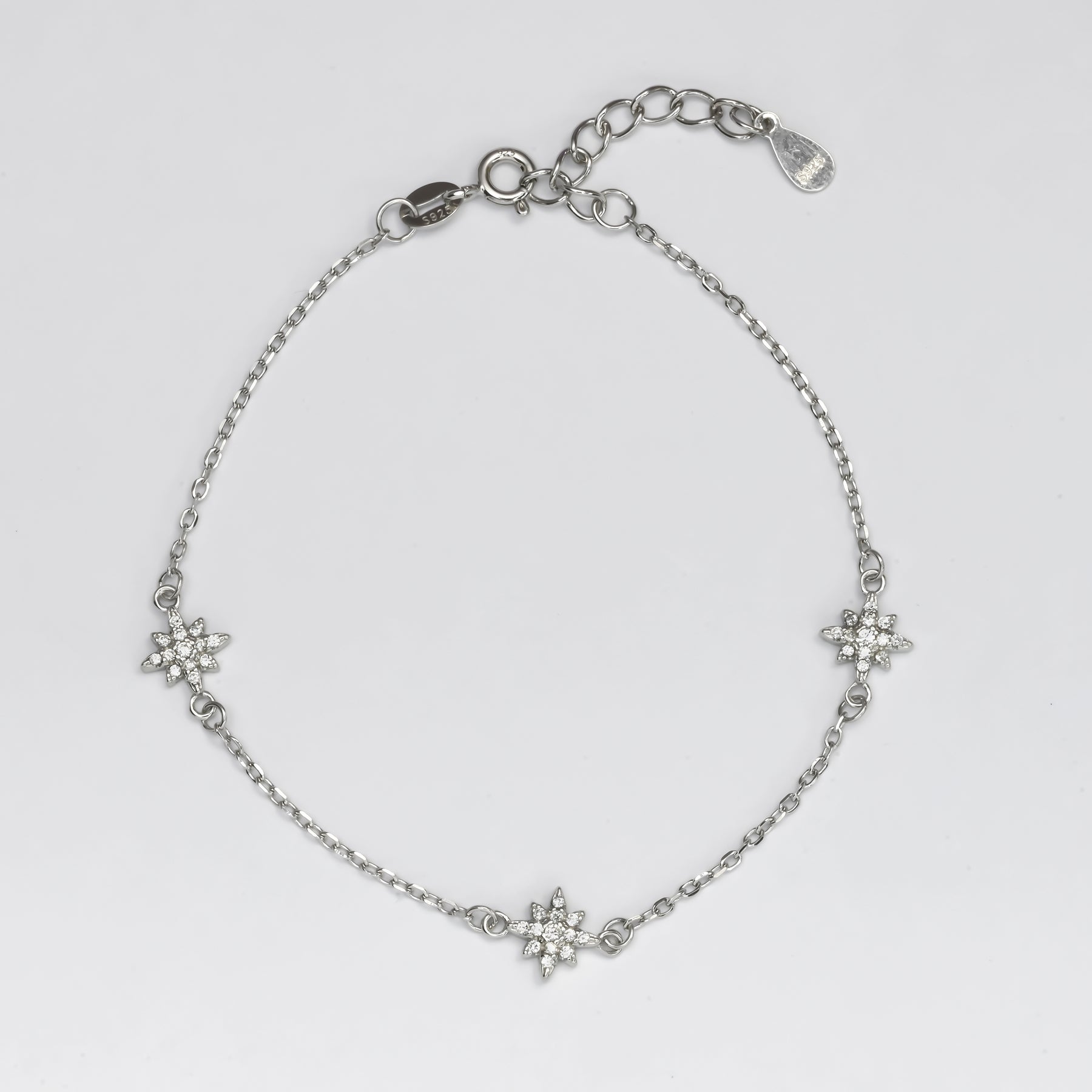 Features three stone-studded star motifs placed evenly along a sleek, adjustable chain. Each star sparkles with fine detailing, adding a celestial glow to your wrist.