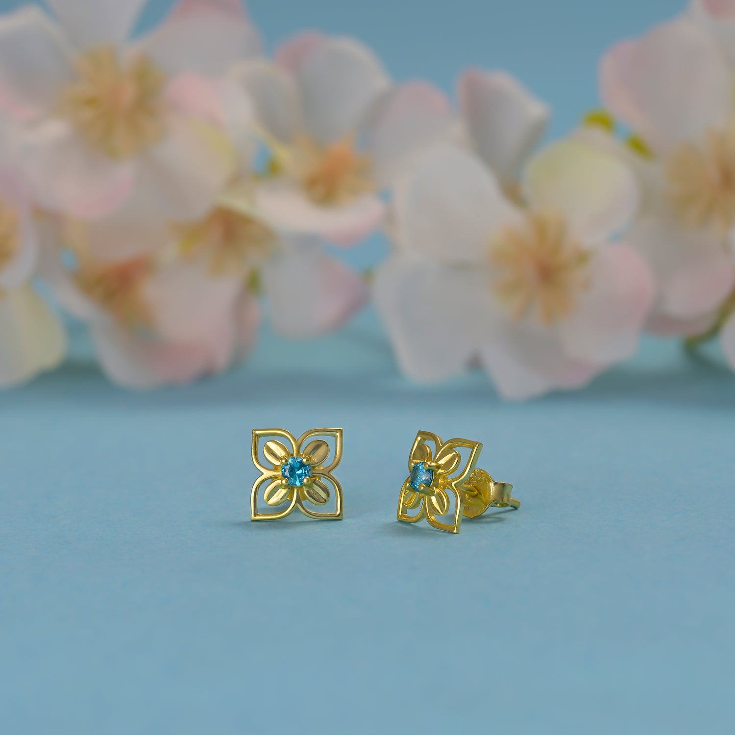 Each earring features a central stone surrounded by four petal-shaped frames, creating a stunning floral motif that adds a touch of elegance to any look.