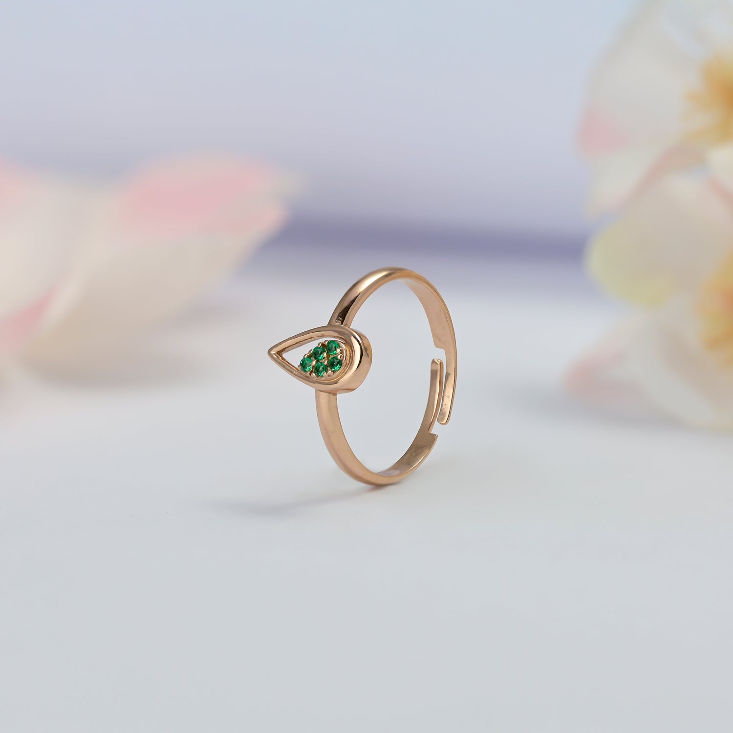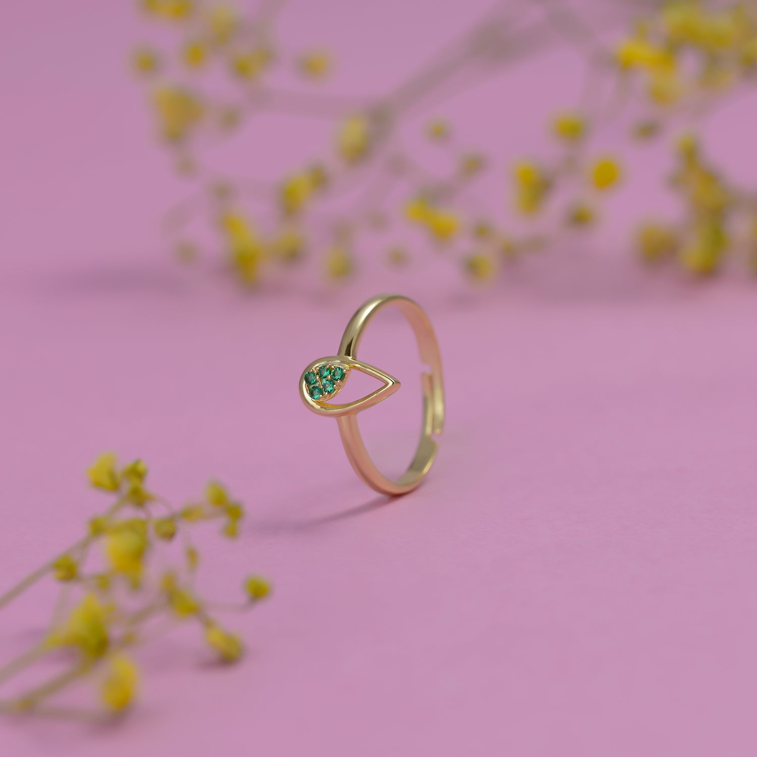 A pear-shaped frame sits gracefully on the finger, with a smaller drop below covered in shimmering stones for extra shine.