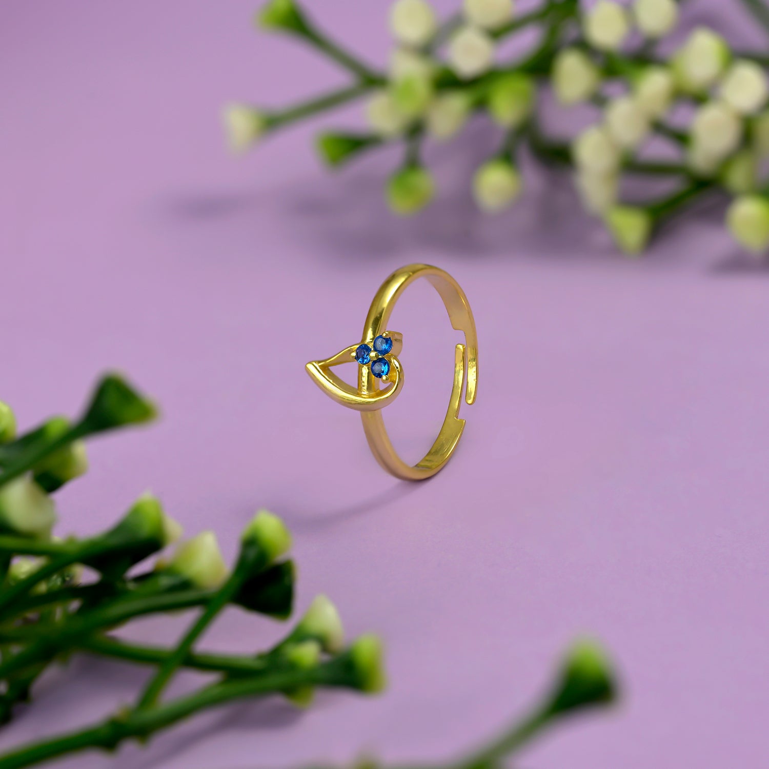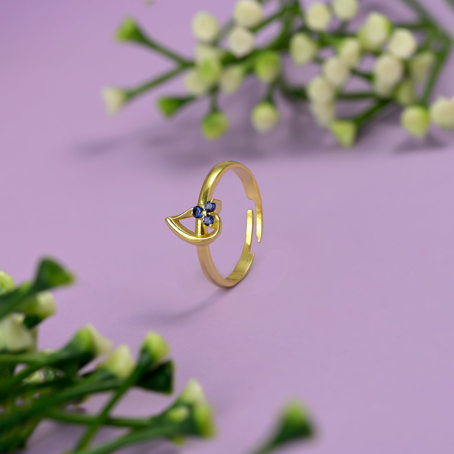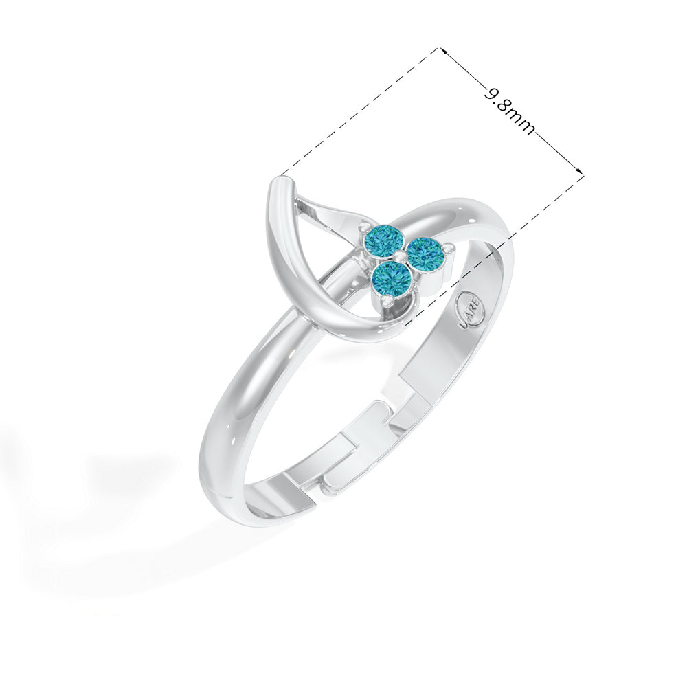 A softly curved drop-shaped frame rests on the finger, with three stones aligned on one side for a graceful shimmer.