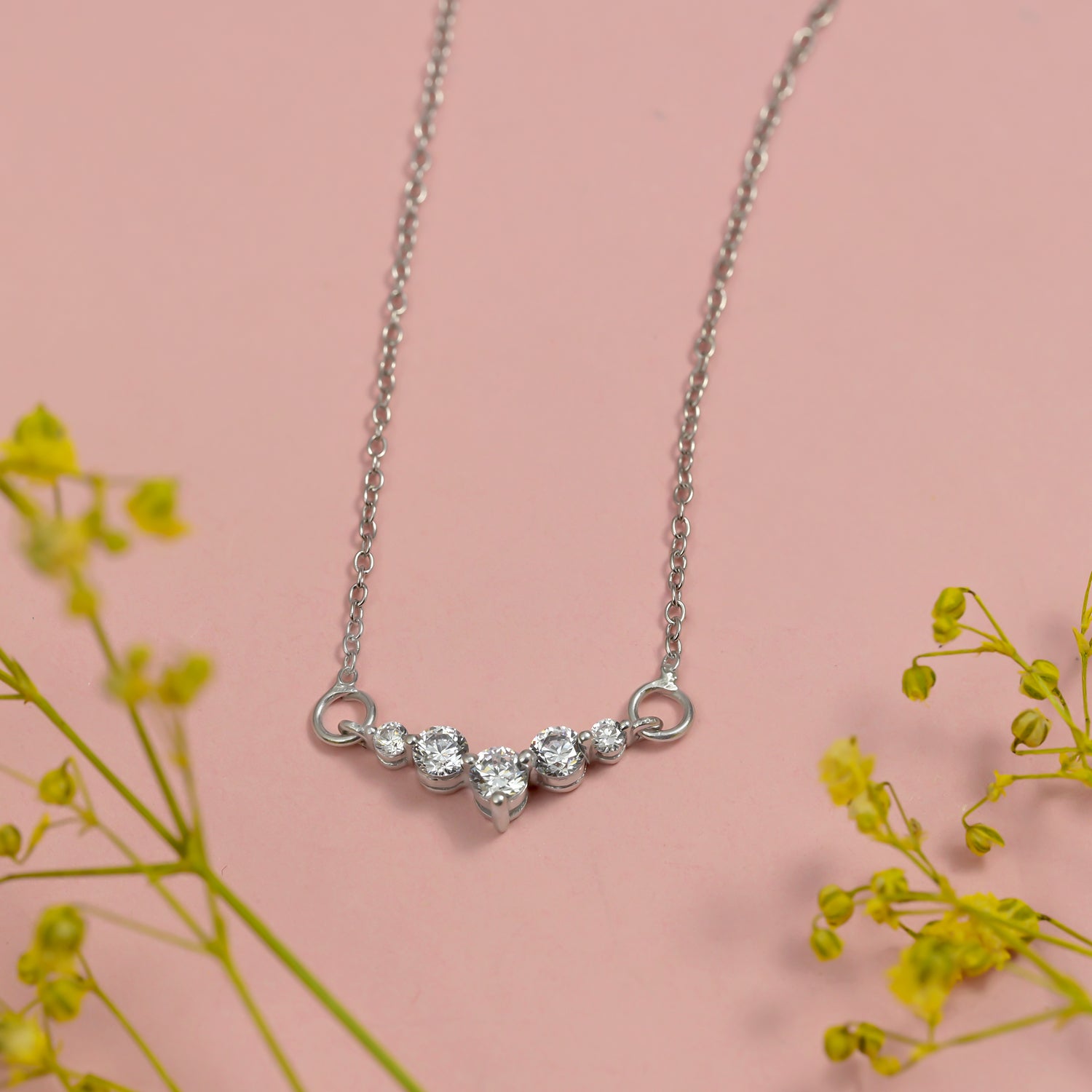 A harmony of brilliance. This Necklace captures the essence of balanced elegance with five radiant stones, featuring a central stone flanked by two smaller stones on each side. Just like YOU, it shines with a perfect blend of symmetry and grace.